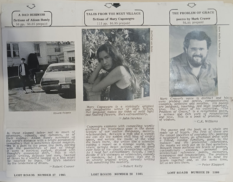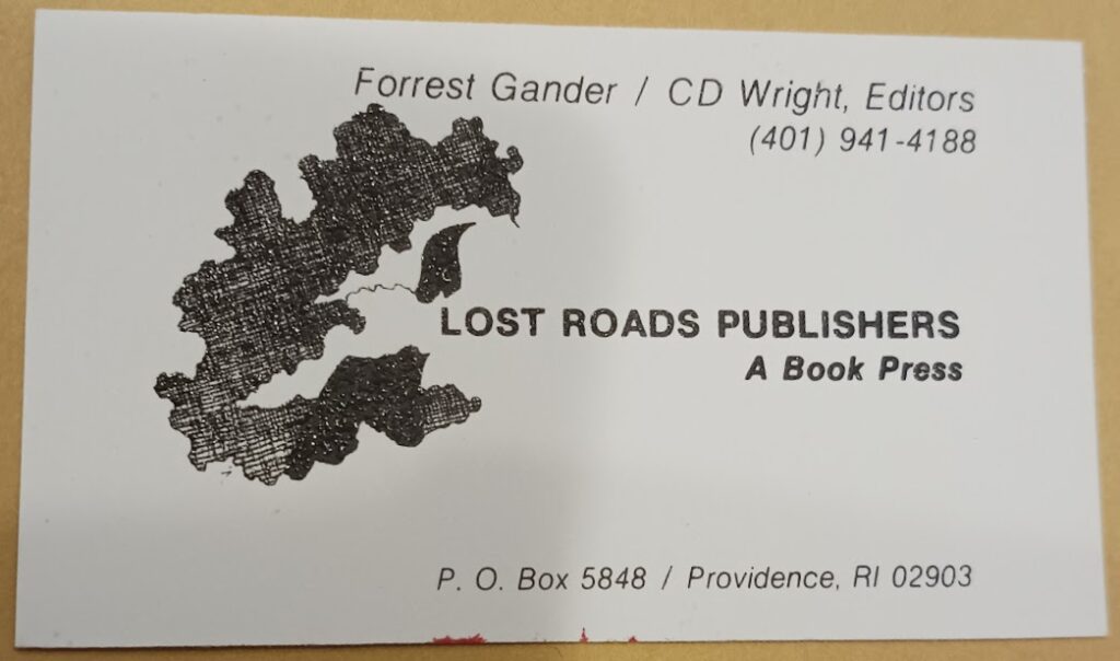 The first document I encountered in the folder of history was a business card from Lost Roads Publishers. It not only provides the press’ name, but also its mailing address, phone number, and logo. Surprisingly, the logo is what drew most of my attention as it was extremely textured under my fingers. Something about the cross-hatching of the ink has created a layered feeling that I can’t imagine achieving with a modern printer.